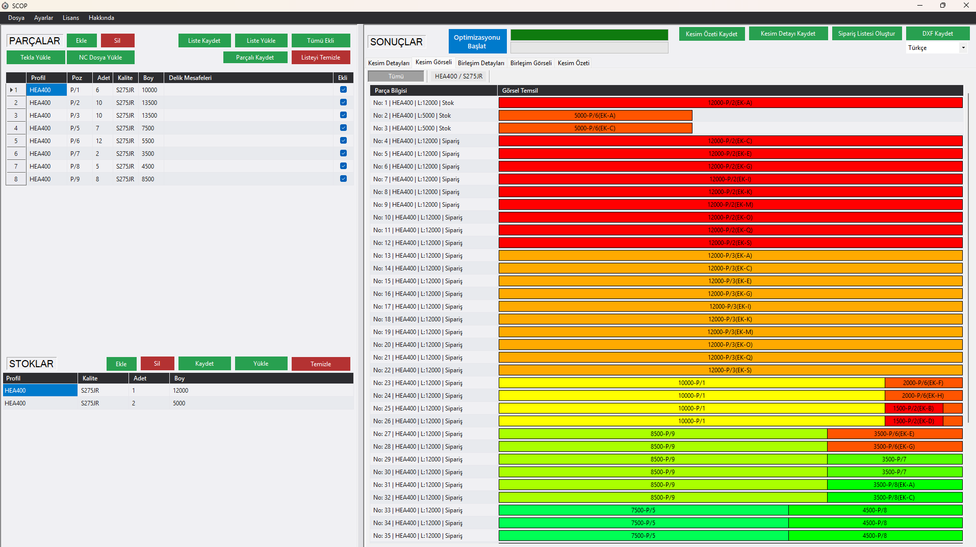 Her stok çubuğunun nasıl kesildiğini renk kodlu grafiklerle anında görün. Fire oranlarını minimize eden akıllı algoritma, ek noktalarını ve delik mesafelerini otomatik hesaplar.